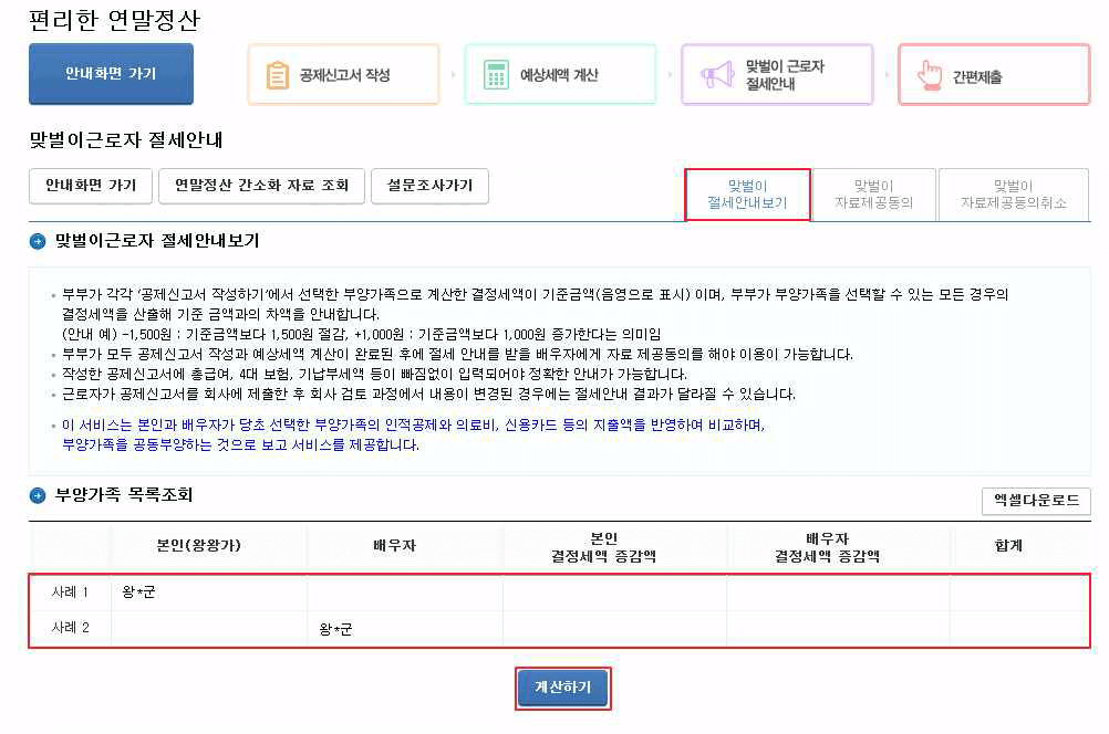* 부부 모두 공제신고서 작성이 완료되어 있어야 [맞벌이근로자 절세안내] 서비스를 이용할 수 있습니다.